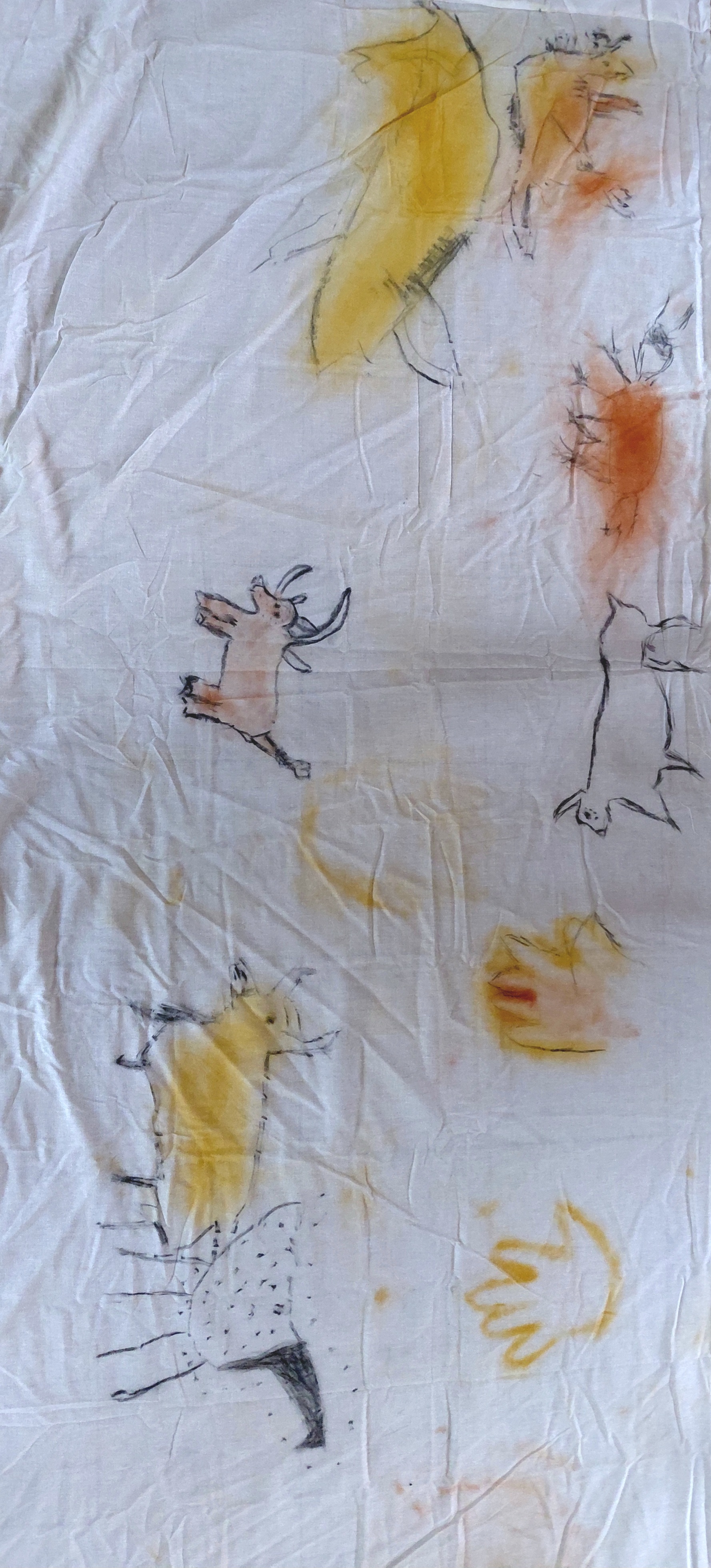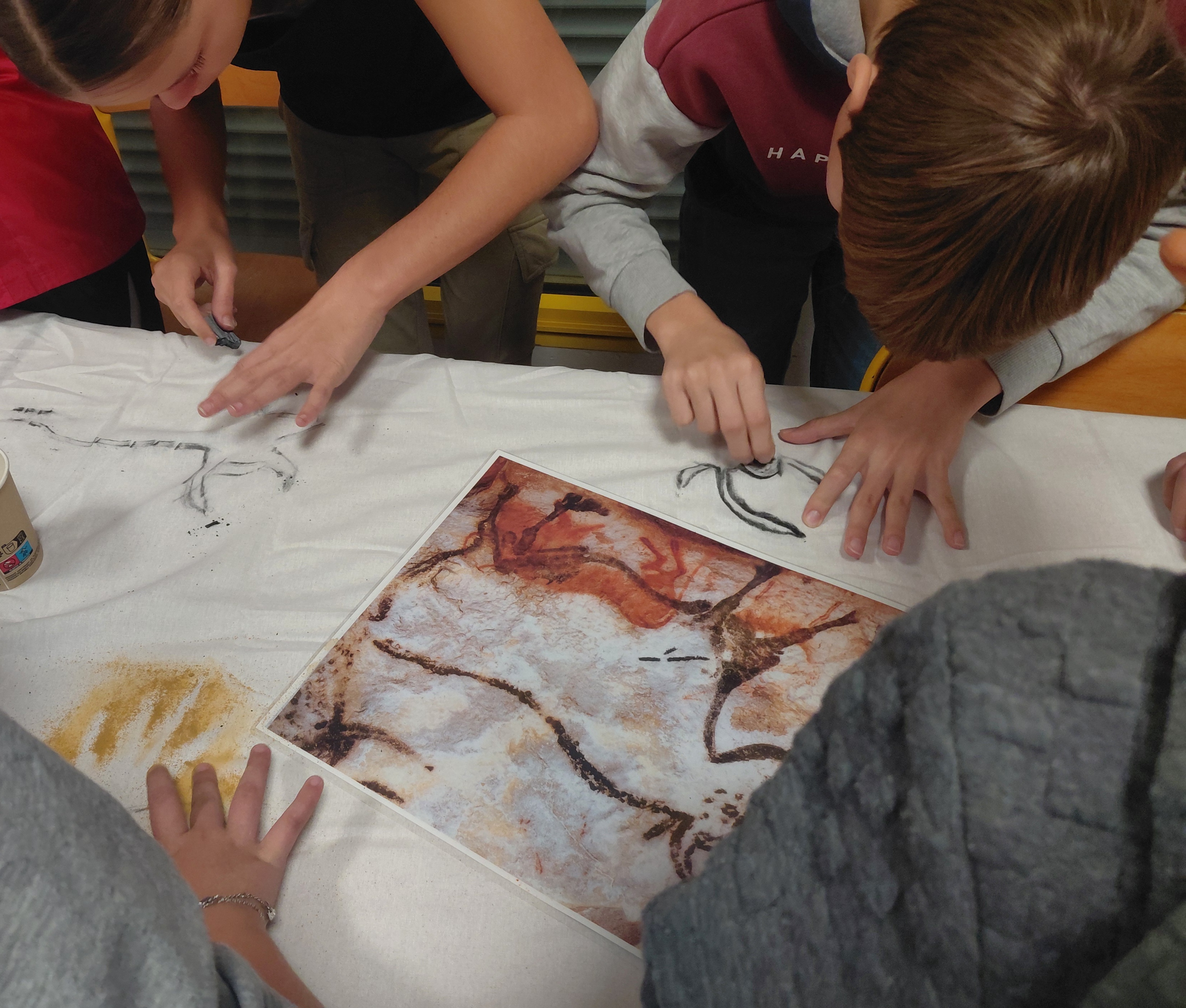 L’enseignement de l’Histoire s’implante plus facilement dans la mémoire des élèves lorsqu’il est appuyé par des éléments réels. Dans le cadre du premier thème d’histoire « La longue histoire de l’humanité et des migrations », les élèves ont pu écouter les explications de Charlotte et poser de nombreuses questions. Ils se sont ensuite vu présenter les matériaux et les techniques de peinture utilisés au paléolithique afin de réaliser eux-mêmes deux fresques collectives s’inspirant des peintures existant dans les grottes de Lascaux et Chauvet.